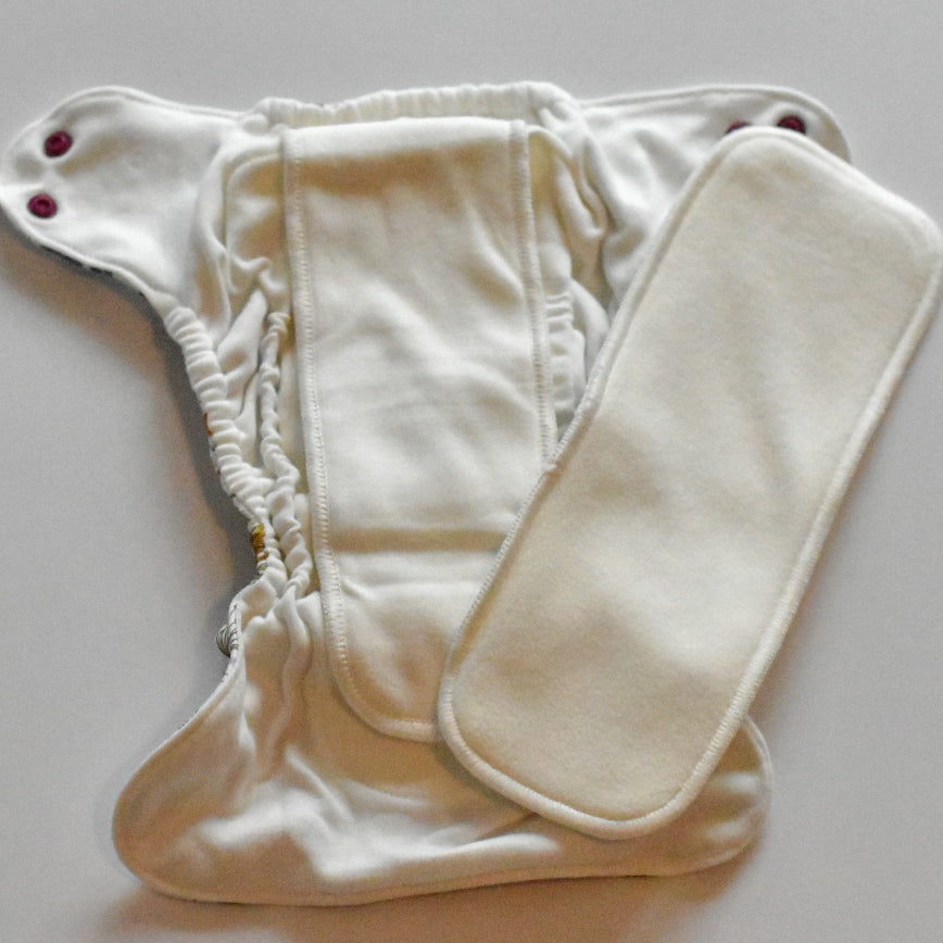 Insert: This is the absorbent part of the diaper, usually made from either microfibre, bamboo, hemp, or cotton. Inserts are either sewn on or added to the nappy.