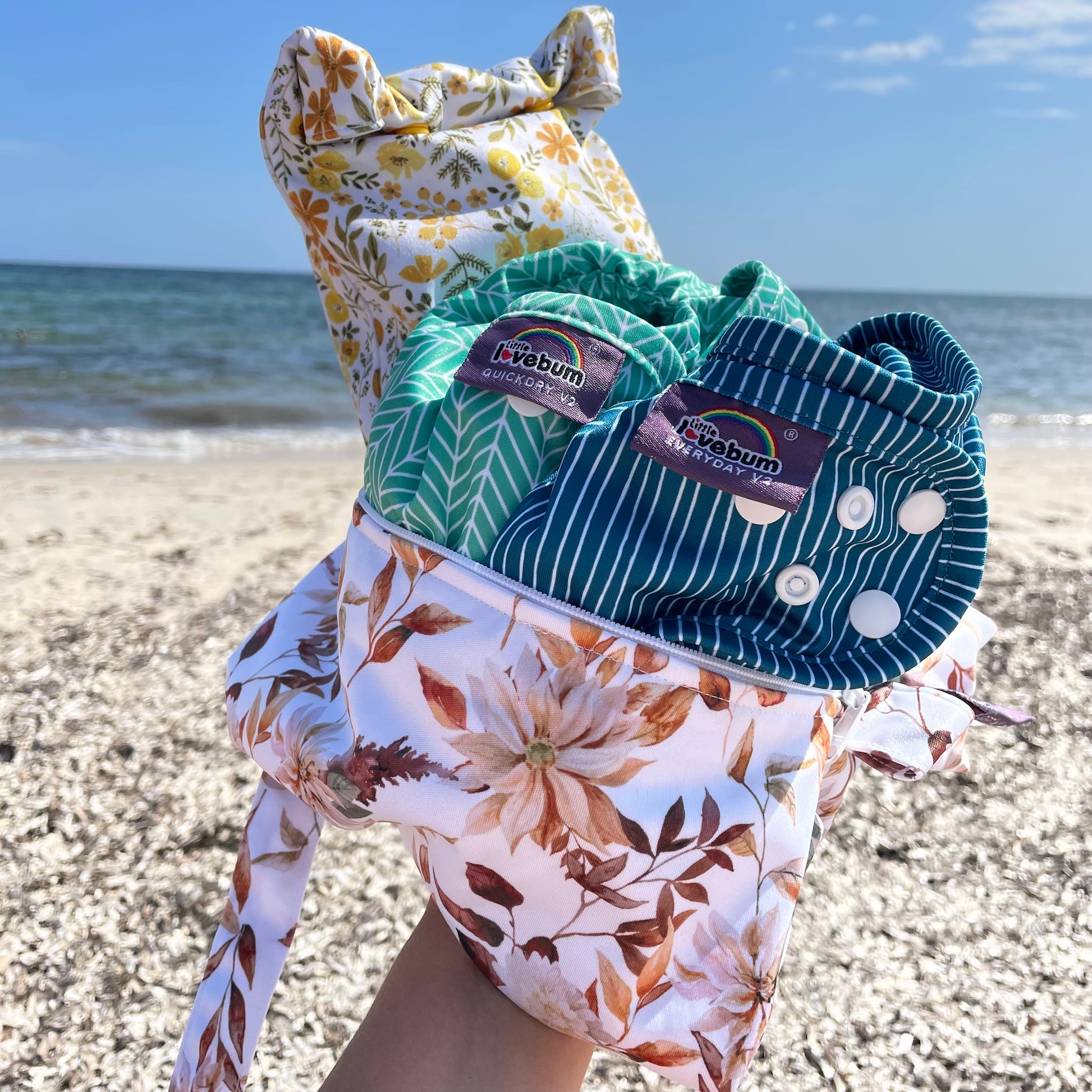 Wet-bag: Used to store clean and dirty nappies in when you are out and about. They are water-resistant. Large wet/dry bags can hang and be used instead of a bucket for storing dirty nappies till wash day.